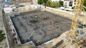 The centerpiece of the project is the hospital building, which spans a total built-up area of 10,146 square meters and rises 8 floors above ground. To ensure structural integrity and ground stability, the hospital is constructed on 299 deep piles. This building is envisioned to host all major medical, surgical, diagnostic, and administrative departments, providing a high-capacity healthcare solution to meet the growing needs of the community.